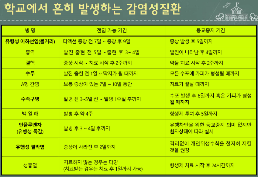 1) 감염병의 증상이 심할 시 의사의 진단 하에 등교중지 기간은 연장 가능하다.