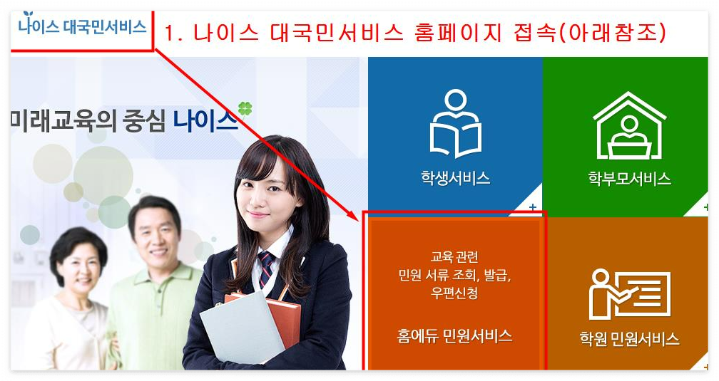 1. 나이스(https://neis.go.kr) 홈페이지에 접속해서 홈에듀 민원서비스로 들어간다.
