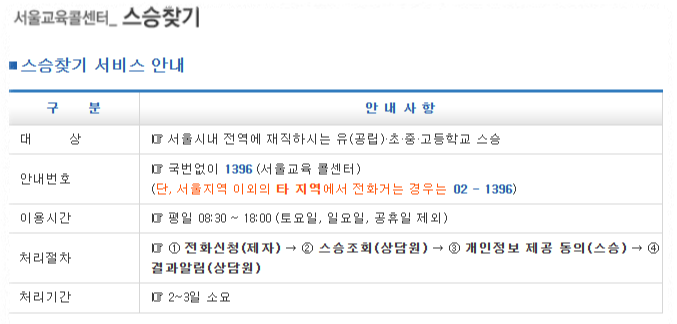 2. 스승 찾기 서비스가 안내되는데 서울의 경우 안내 번호 1396번에 전화를 연결하면 된다.