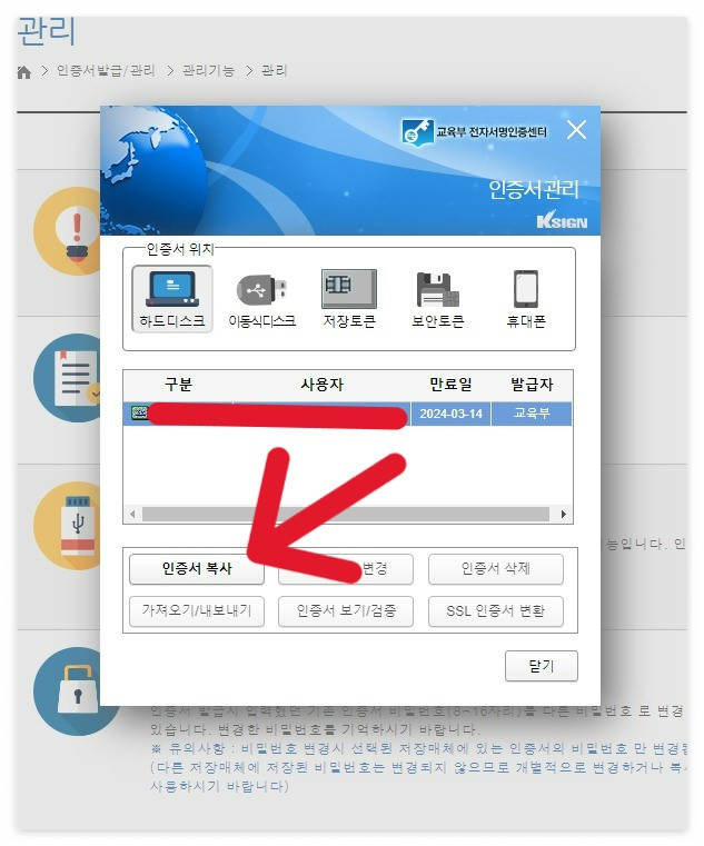 3. 복사하고 싶은 인증서를 선택 후 인증서 복사를 눌러준다.