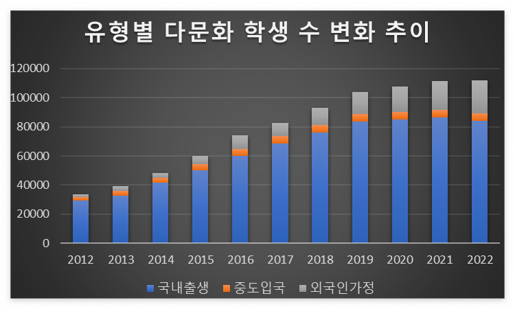 - 2022년 초등학교의 다문화 학생 수는 111,640명으로 2012년 33,740명 대비 약 3.3배 증가하였다.