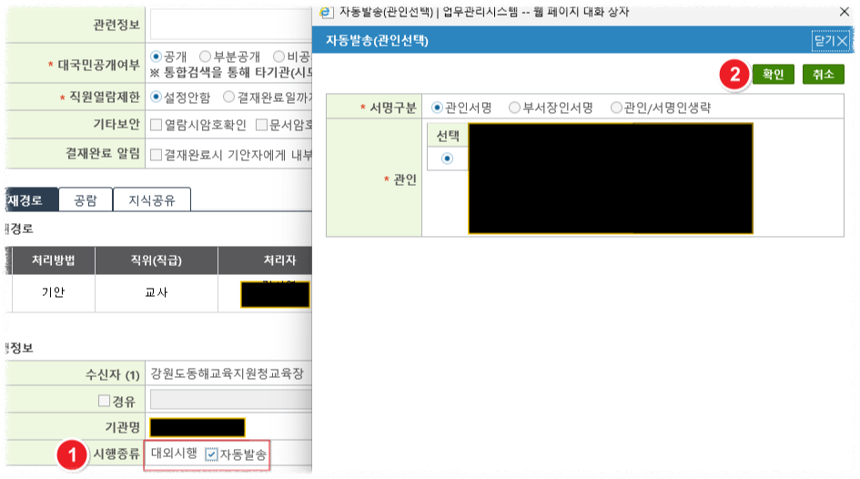 - 최종 결재 후 바로 공문이 바로 발송될 수 있도록 자동발송 꼭 클릭하기(클릭 안 할시에는 완결 후 기안자가 따로 보내야 함!)