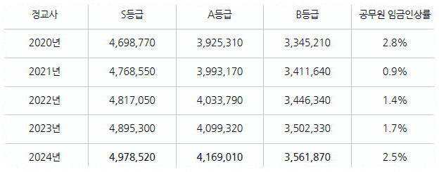 출처: 2024년< 공무원봉급표< 성과·보수제도< 공무원 인사제도< 인사혁신처 (mpm.go.kr)