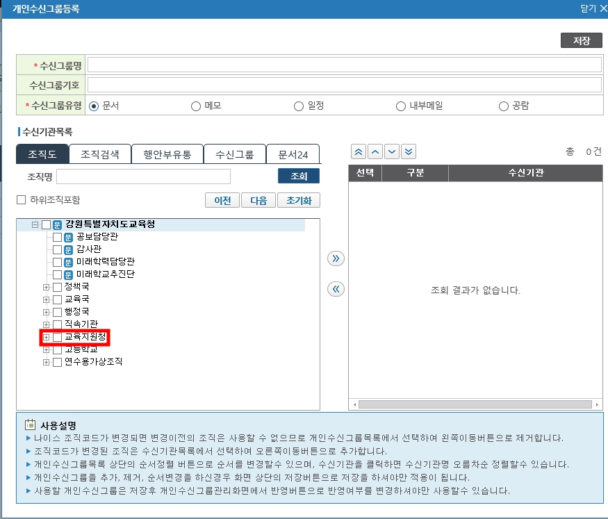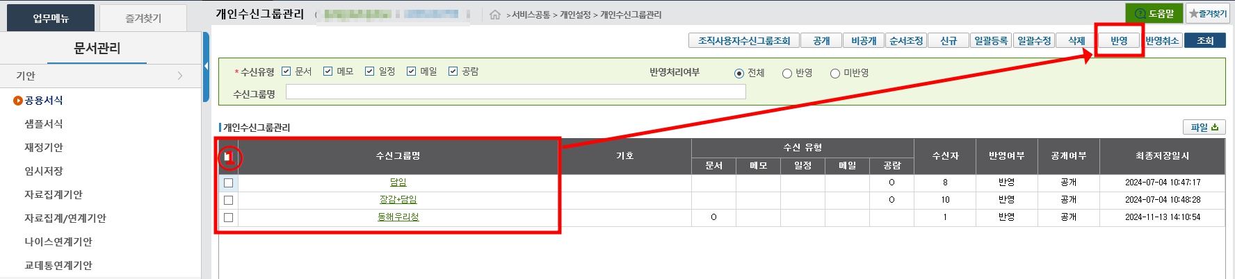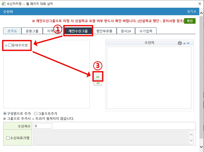 [수신자지정] - [개인수신그룹]에 우리청이 생긴 걸 확인할 수 있다.