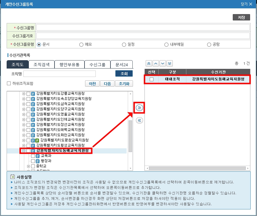 평소 자주 공문을 보내는 우리청(교육지원청)을 등록해 주면 된다.