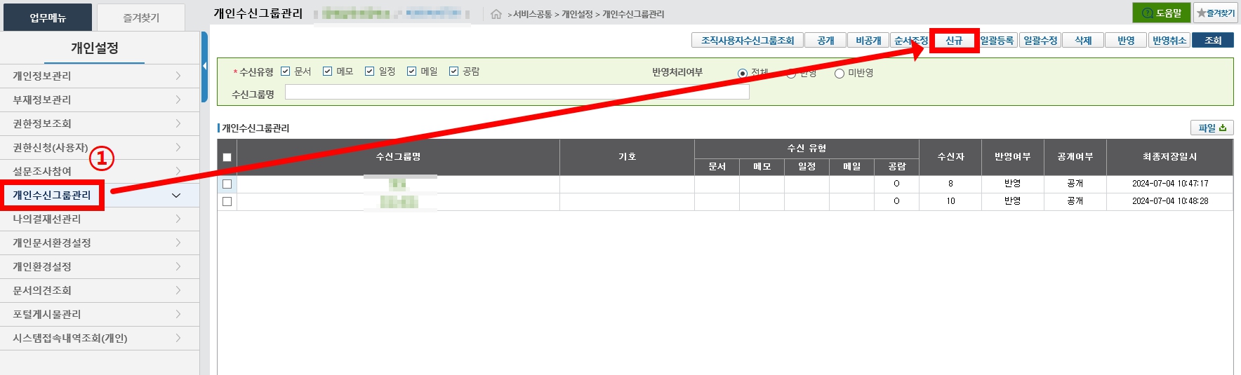 [개인설정] - [개인수신그룹관리] - [신규]로 들어간다.