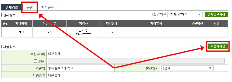 마지막으로 아까 수신자 지정과 공람그룹 지정을 완료했다면